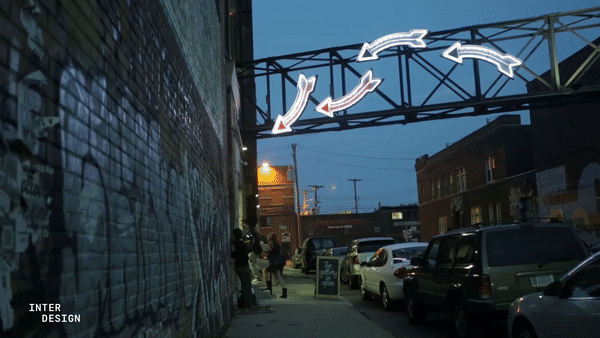 A projected window display that references the grid system dynamically shows the identity system in action, as well as, Interdesign Detroit's participation in the community.
